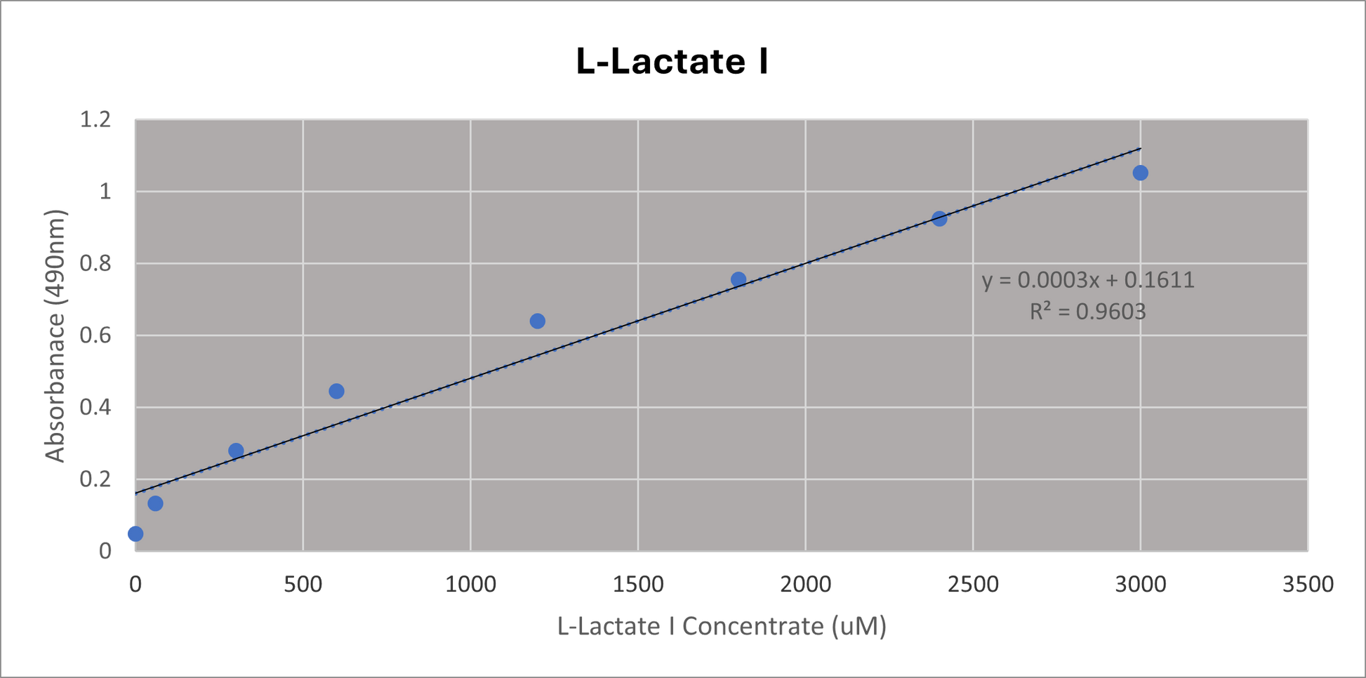 L-Lactate(µM)= [ (Corrected absorbance)-(y-intercept)]/slope